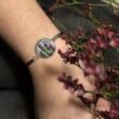 Wzór wyhaftowałam na filcu, używając bawełnianych nici. Metalowa przywieszka w kolorze srebrnym ma średnicę 1,8 cm. Metalowe elementy łączą się z bawełnianym, woskowanych sznurkiem w kolorze czarnym. Zapięcie jest z przedłużką, dzięki czemu obwód bransoletki jest regulowany od 15 do 20,5 cm.